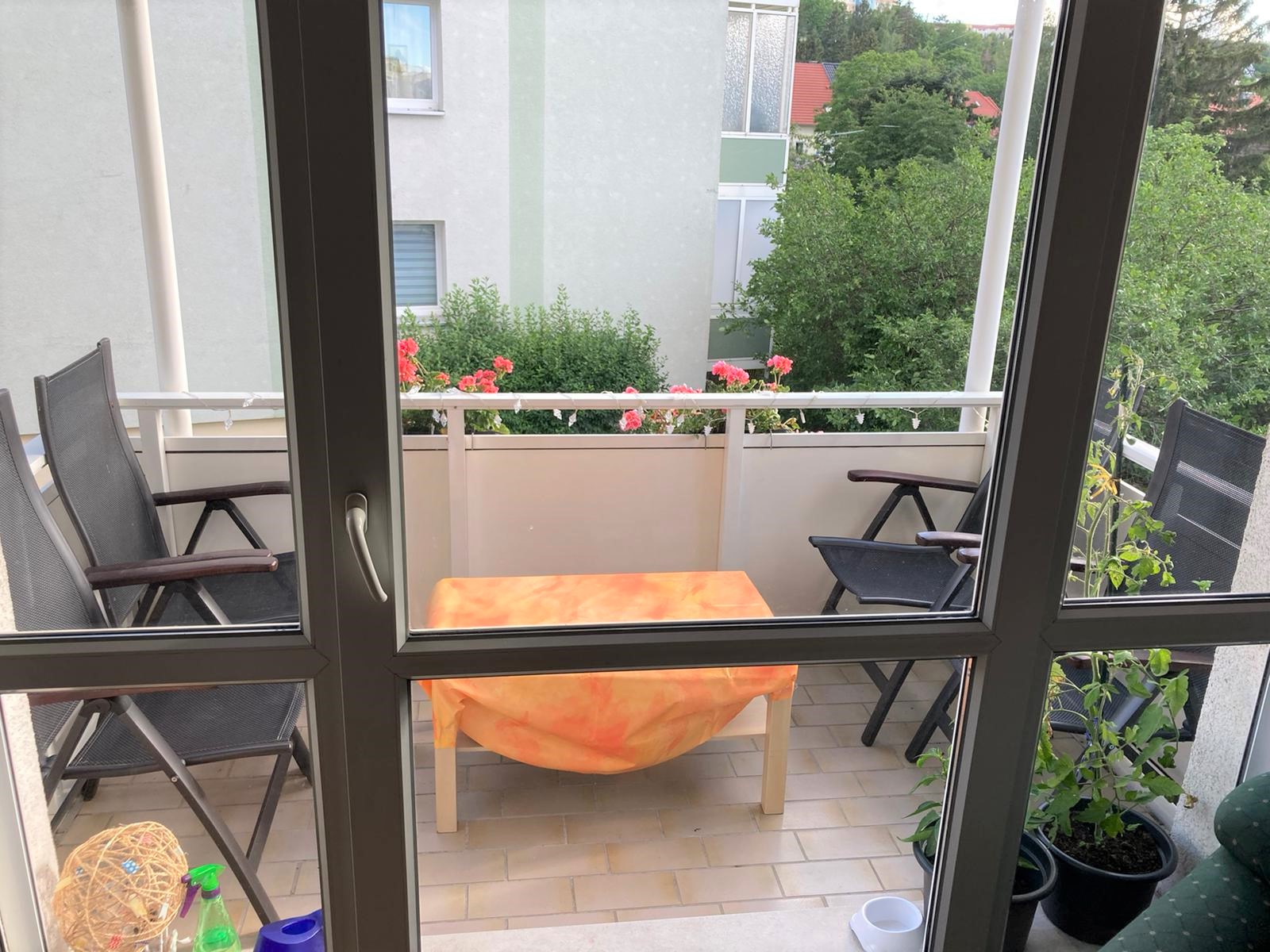 Der Balkon mit Blick in den Hof ist vom Wohnzimmer erreichbar.