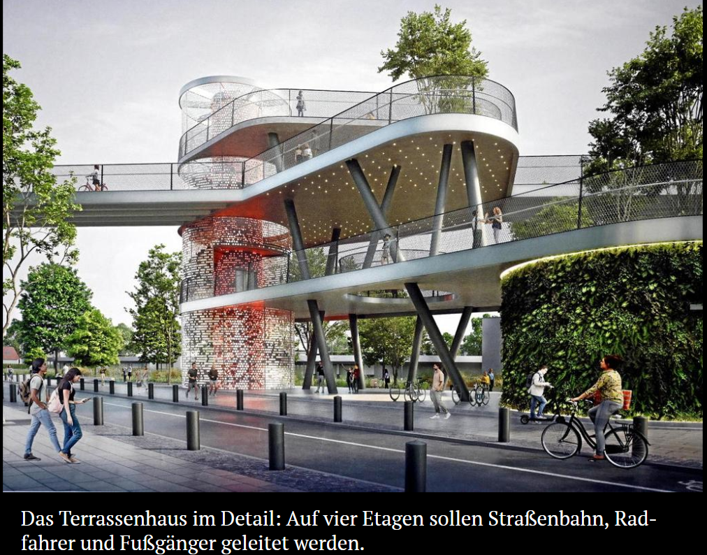 Der leicht dahingesagte Schlüssel zum Erfolg liegt in einer zentralen Haltestelle, um die herum sich alles Weitere angliedert. So soll ein sogenanntes „Terrassenhaus“ entstehen.